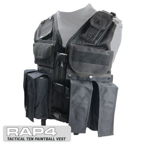 If you are looking for a paintball vest that is comfortable and able to carry a load of paint this Tactical Ten Paintball Vest configuration is the one for you. This configuration can hold 1400 paintballs and still have room for expansion to hold more. Tactical Ten—Modular Paintball Vest This vest is specifically designed for players in the intense new tactical paintball league: the Tactical Ten Paintball League ( www.tacten.com ) The vest is designed to be highly versatile and thus adaptable for various different tactical roles such as: sniper heavy gunner light rifleman and commander. Each and every pouch is interchangeable and allows the user to configure the vest to their tactical role their style of play and the demands of that particular scenario. The Tactical Ten Paintball Vest can be configured for heavy gunners who need to carry more than 2000 paintballs—that’s more than a case—all the way down in weight to commanders who only carry paintball pistols and paint grenades. The vest can be configured to hold a paintball pistol and magazines radios paint pods maps compressed air or CO2 tanks smoke grenades small props tools…it has endless possibilities. The Tactical Ten Paintball Vest allows you to adapt the vest configuration that fits your playing style. The Tactical Ten Paintball Vest is made with the same material as standard military gear for extreme durability and even includes a drag loop should you need a little help off the field. With the Velcro-and-snap interface panels that cover this vest you will be able to build the perfect outfit for all weather situations and games—just what you need for the Tactical Ten Paintball League! More information and specification More images of the vest More vest accessories K ey Features: - all pouches are interchangeable - completely ambidextrous for left users - pod pouch can hold 100 140 qloader pod and water bottle - big holster can hold all .68 caliber paintball pistols - back
